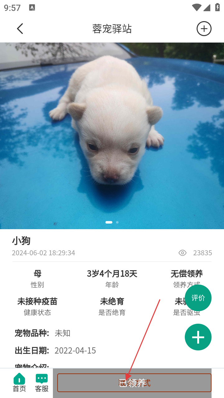 4、进入宠物详情页,能了解宠物性别、年龄、健康状态等,若符合条件,可进行领养操作。