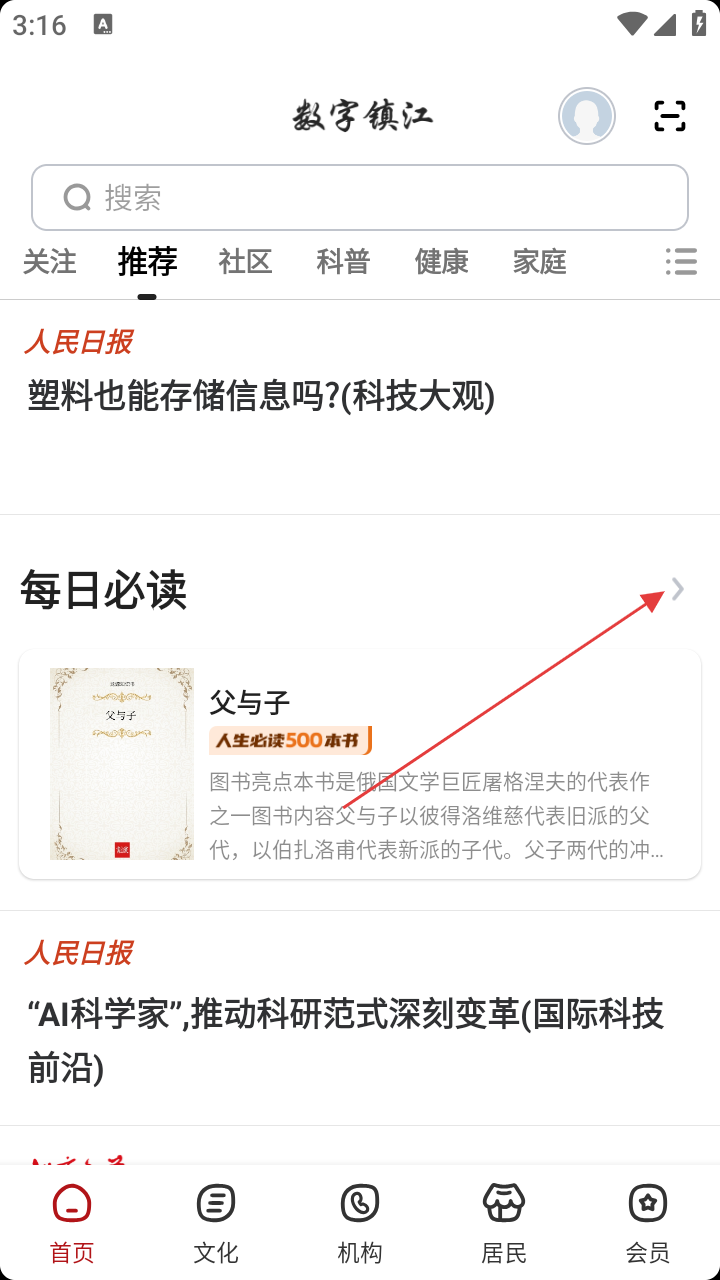 1、打开数字镇江,在【每日必读】栏,点击右侧箭头查看更多书籍。