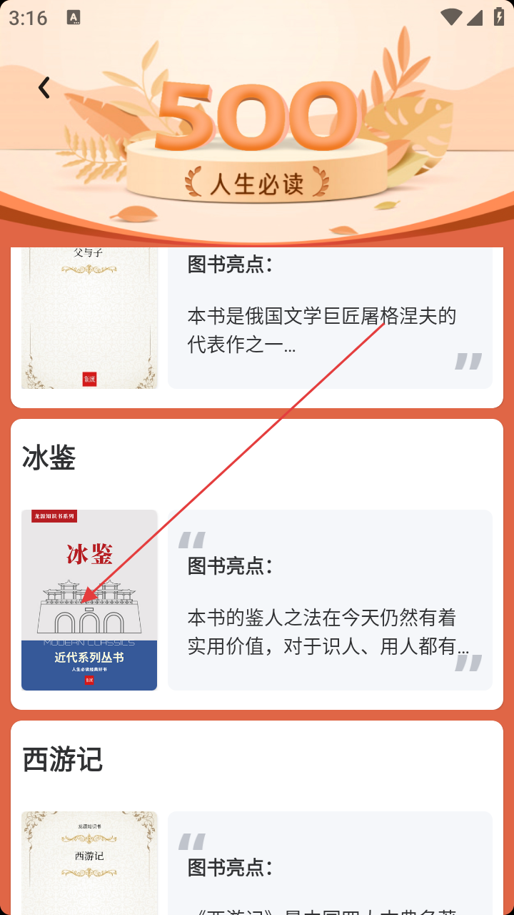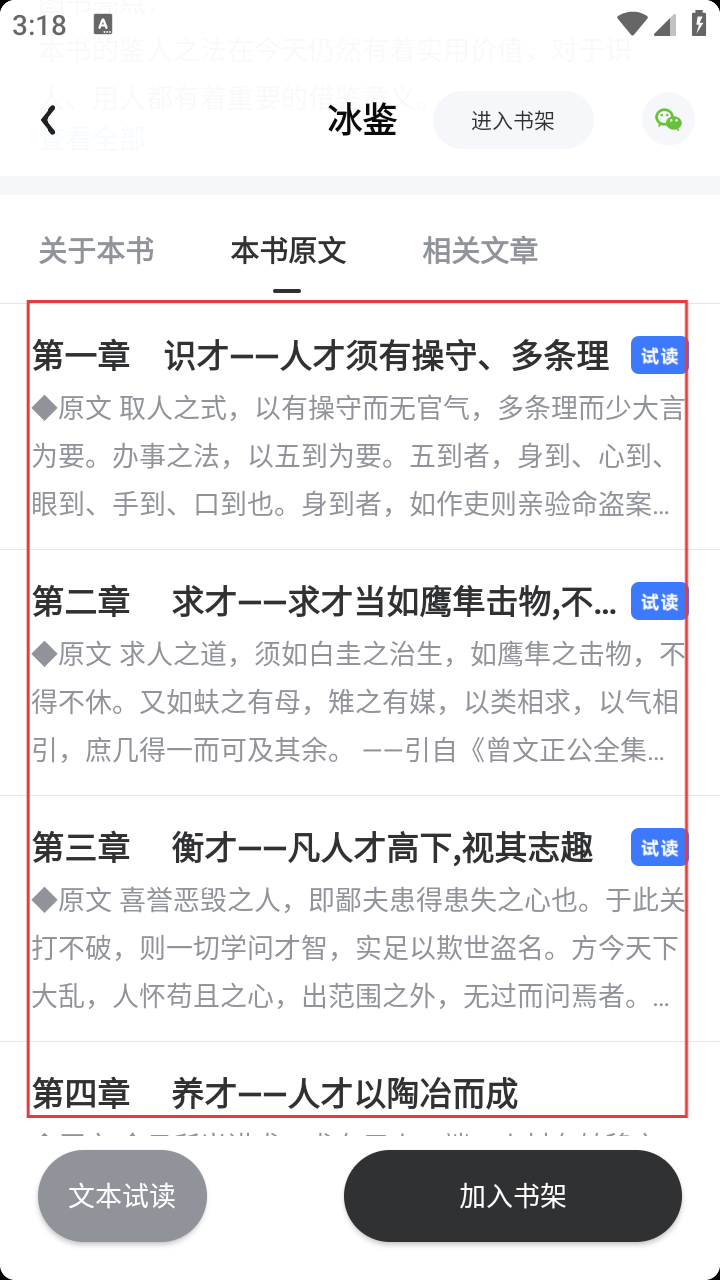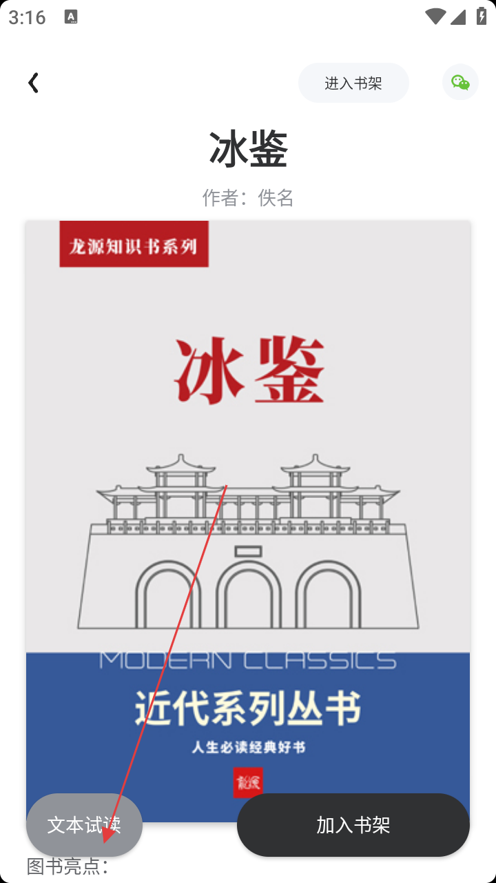 2、在书籍列表,选感兴趣的书,如《冰鉴》,进入详情页。