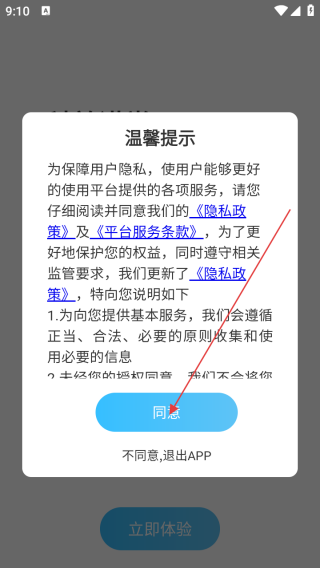 1、打开应用查看温馨提示点击同意。