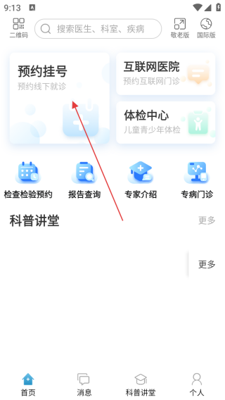 2、进入应用首页点击预约挂号。
