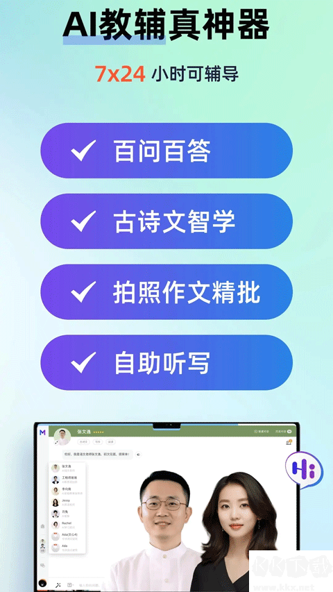 1、跨科目指导:涵盖古诗文智能背诵、打卡记忆,段落仿写与作文,英语单词、对话练习,以及综合知识问答等功能,给予多方位学习支持。