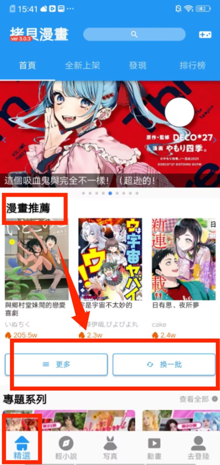 1、打开软件后,在底部导航栏点击 “精选”,可浏览漫画推荐,还能通过 “更多”“换一批” 查看不同漫画内容。