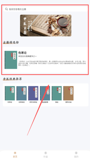 1、下载安装后,用户可在首页浏览推荐的中医经典书籍,轻松获取相关知识,方便快速查找感兴趣的内容。