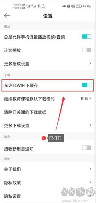 2、开启允许移动网络缓存功能开关。