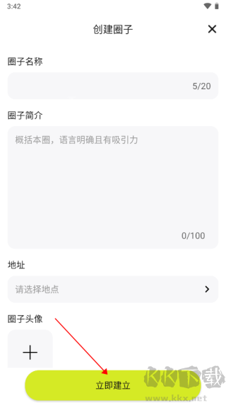 2、依次输入圈子名称、简介、地址、添加圈子头像即可建立圈子。