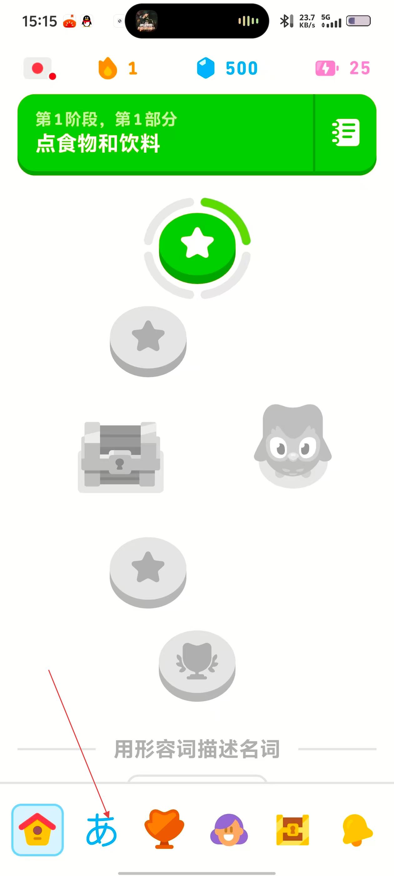 2、进入多邻国APP学习页面后,点击底部日语相关图标,进入日语学习模块。