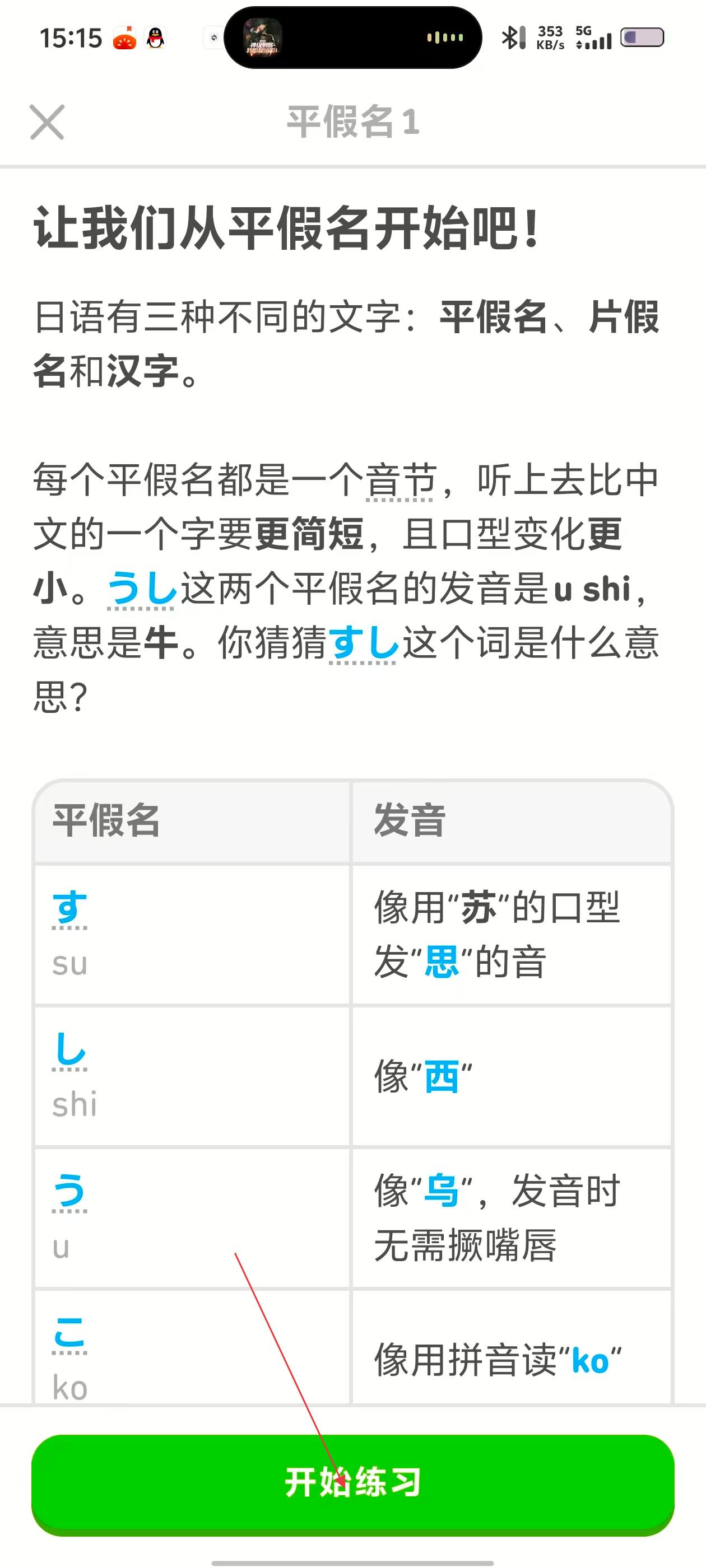 3、在日语学习页面,查看平假名学习内容,了解后点击【开始练习】按钮。