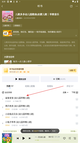 2、进入儿童的页面内,选择并点击要听的歌单。