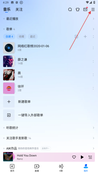 1、打开酷狗音乐APP,点击我的页面右上角三条横线的菜单图标。