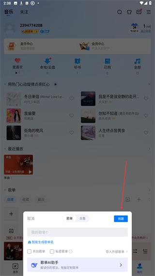 3、填写想要创建的歌单名称,确认点击弹窗中的创建按钮,即可完成。