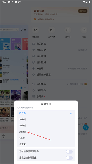 3、在下方弹出的定时关闭页面,点击30分钟即可开启。