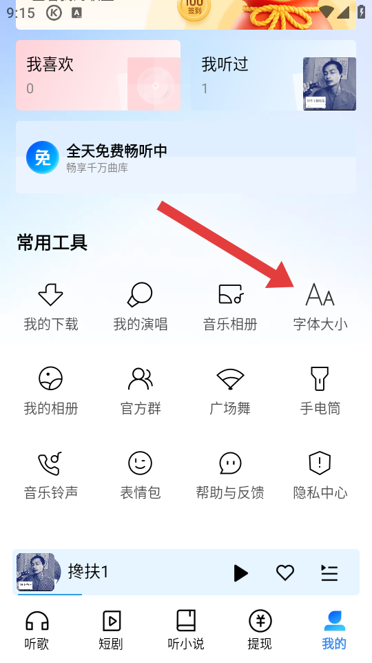 2、在个人页面的常用工具区域,点击字体大小,进入字体大小选择界面。