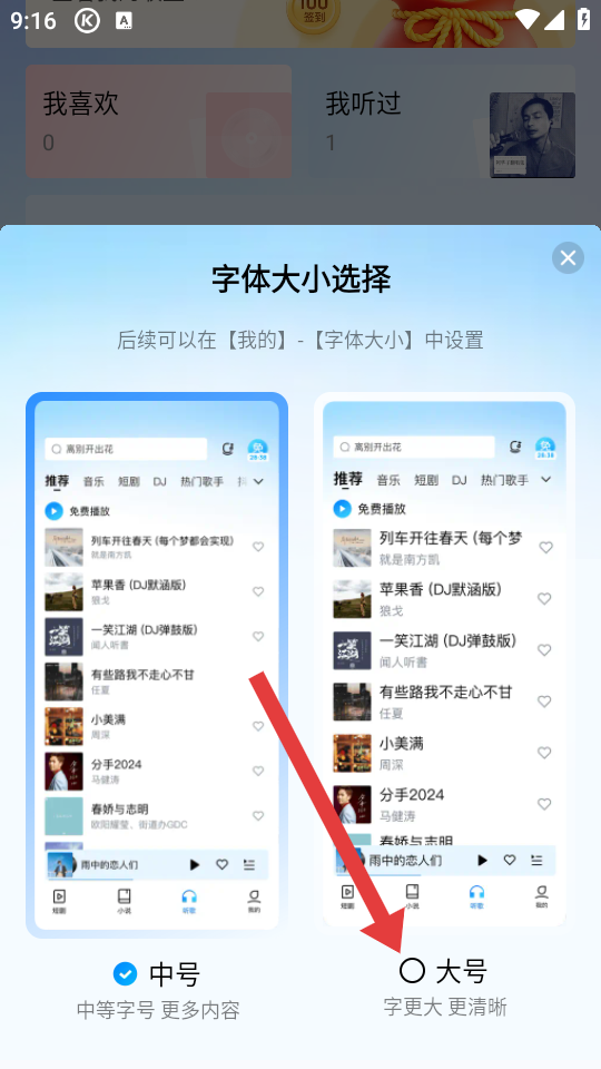 3、在字体大小选择界面,可以选择大号等字号选项,选择后即可调整APP内的字体大小。