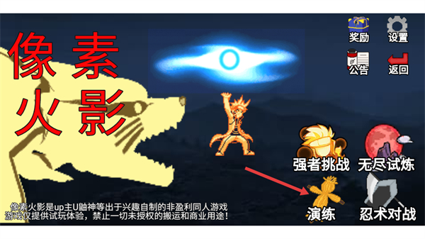 1、点击【开始游戏】开启像素火影之旅,也可选择【对战练习】熟悉操作,结束后点击【退出游戏】关闭。
