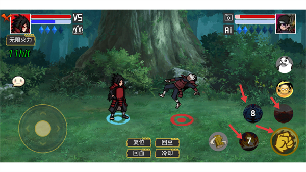4、点击右侧的忍术、攻击按钮释放技能,与AI对手进行对战演练。
