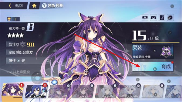 1、在主界面点击角色选项,进入角色列表后选择目标角色,点击右侧育成按钮进入角色详情页面。