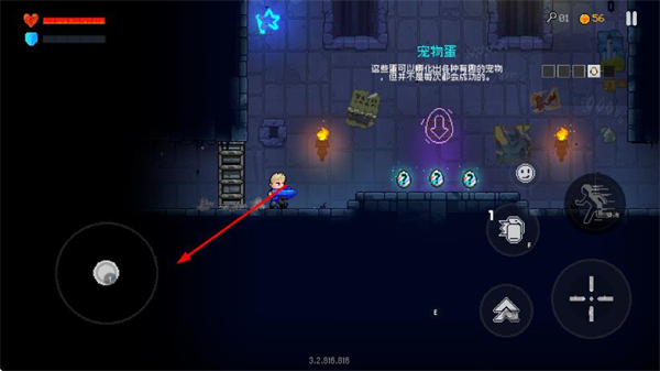 1、通过左侧虚拟摇杆控制角色移动,探索地牢场景收集资源。