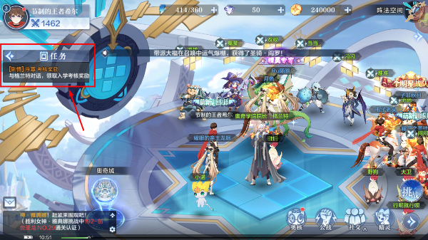 1、点击界面中的【任务】按钮,查看当前目标如进入学院禁地找【兰斯洛特】,按指引推进可解锁更多剧情与奖励。