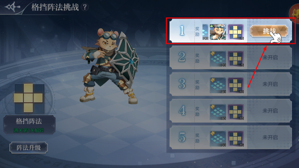 1、进入格挡阵法挑战界面,选择可挑战的【1】关,点击【挑战】按钮开始关卡,可先进行阵法升级提升战力。