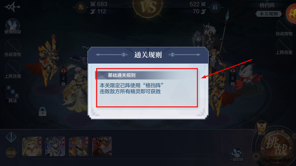 2、查看通关规则,本关需使用【格挡阵】击败敌方所有精灵,需提前熟悉阵法特性与精灵搭配。