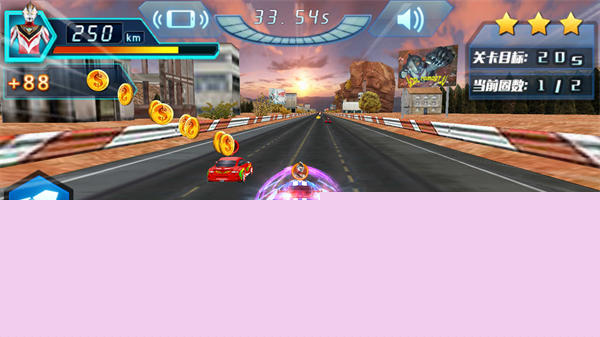4、使用技能道具增强行驶能力,持续保持高速前进,完成当前圈数的赛程,向关卡目标推进。
