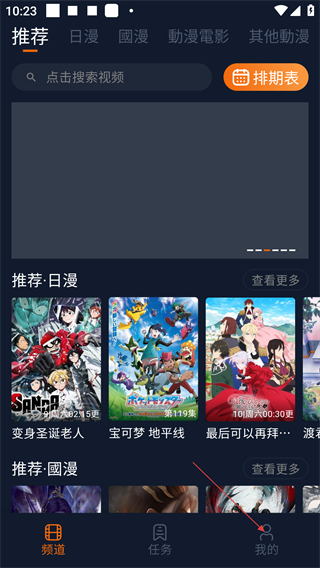 1、打开应用进入首页面,可通过顶部分类栏选择动漫类型,也能搜索视频,点击底部【我的】进入个人页面。