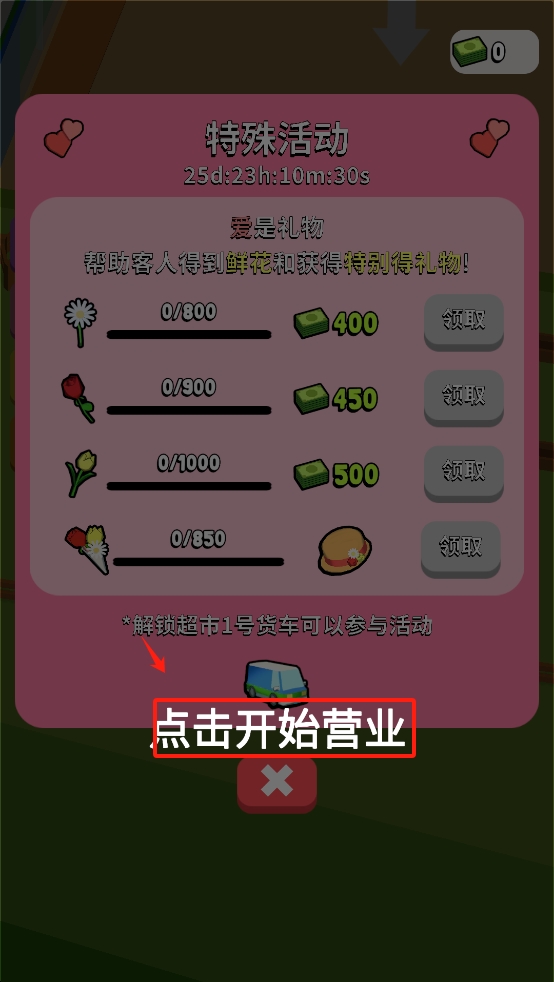 1、在游戏主界面,点击底部的“点击开始开始营业”按钮,参与活动。