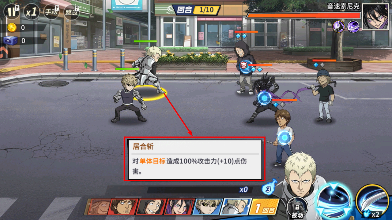 1、战斗时用【居合斩】对单体目标造成100%攻击力加10点伤害,快速消耗敌方单体血量来建立优势。