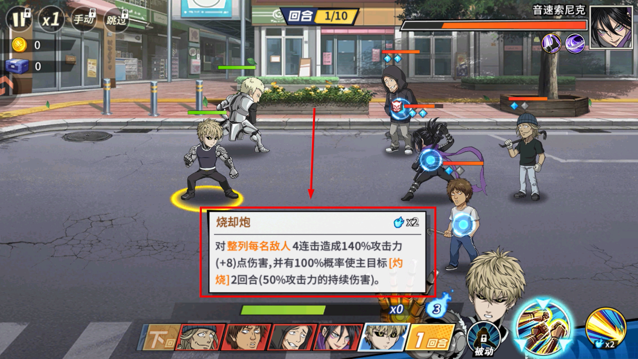 2、释放【烧却炮】攻击整列敌人,4连击带来140%攻击力加8点伤害,还能让主目标灼烧2回合持续掉血。