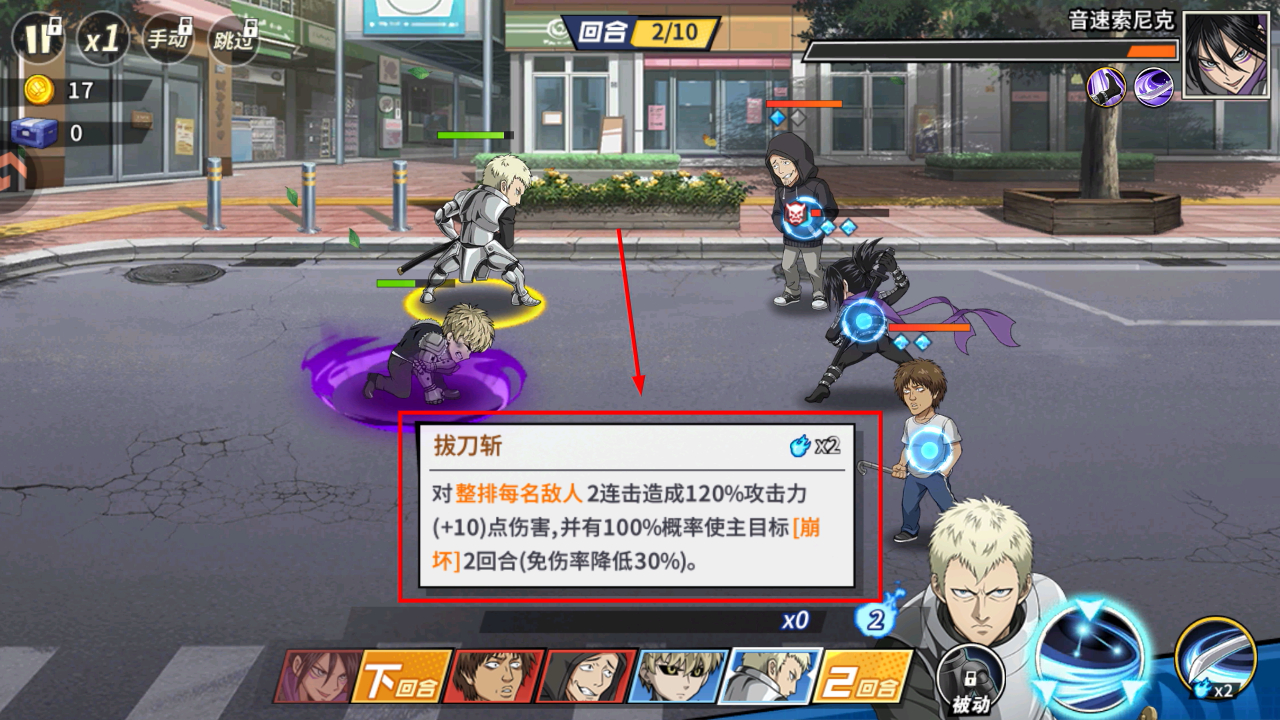 3、使用【拔刀斩】攻击整排敌人,2连击造成120%攻击力加10点伤害,主目标会被破坏2回合免伤率降30%。