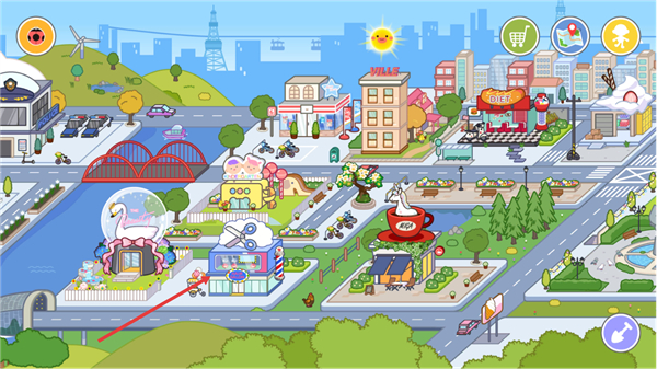 1、启动时点击界面中间的播放按钮即可进入,进入后呈现包含理发店、商店等建筑的小镇场景,可直接点击任意建筑进入对应的互动空间,操作简单无门槛。