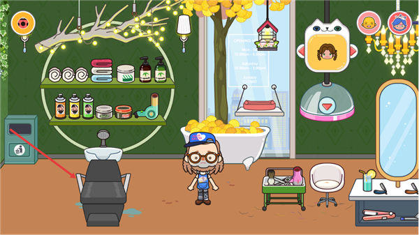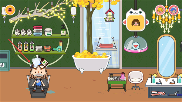 3、进入具体场景后,可操作角色进行对应互动,比如在理发店让角色坐理发椅,点击架上用品触发互动动作,体验场景对应的生活行为。