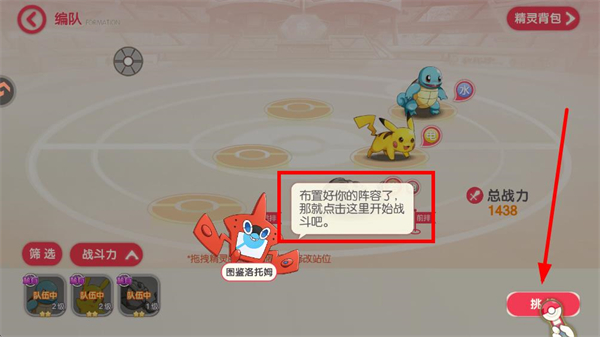3、在编队界面,布置好精灵阵容后,点击挑战按钮,进入战斗准备流程。