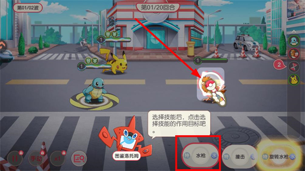 4、进入战斗界面后,选择精灵技能,点击目标释放技能,完成对战击败敌人即可推进关卡。