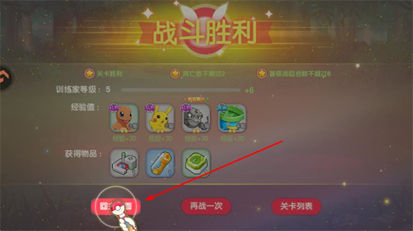 4、战斗胜利后,领取精灵经验、道具等奖励,点击回主面返回主界面,可继续挑战关卡或培养精灵。