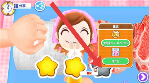 3、烹饪若未达理想(如星星评价),可点击【重试】,选择使用金币或看广告重新进行烹饪操作。