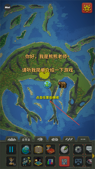 1、进入游戏后的初始引导界面,按照提示点击任意处,即可推进游戏介绍的引导流程,逐步了解游戏的基础功能与核心设定,开启世界模拟的流程。