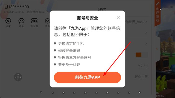3、在提示框中点击前往九游APP,根据提示完成操作。
