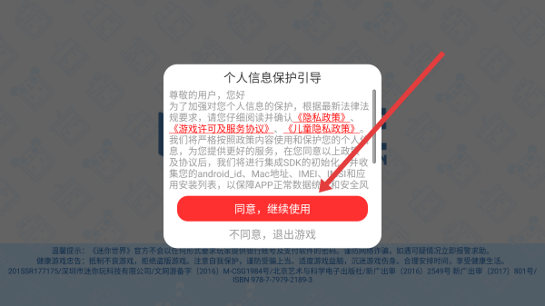1、在打开迷你世界app后,通过点击弹窗中的同意继续使用按钮,进入使用。
