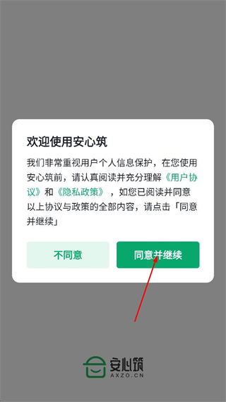 1、阅读用户协议和隐私政策后,点击同意并继续按钮,进入安心筑的登录页面。