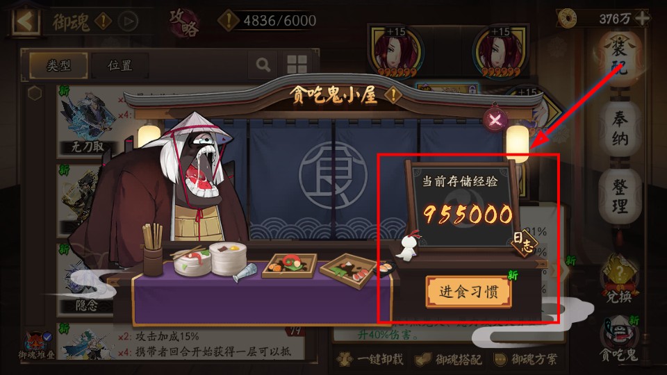 1、进入【贪吃鬼小屋】可查看【当前存储经验】数值,通过【进食习惯】管理御魂经验的存储与使用。