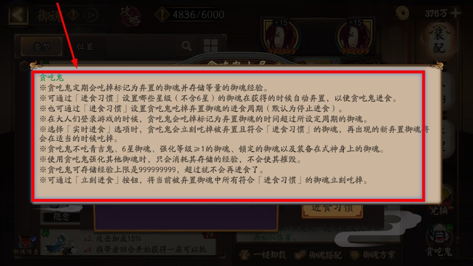2、了解【贪吃鬼】核心规则,明确其不吃的御魂类型及经验存储上限等关键限制条件。