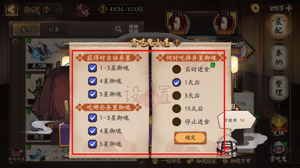 3、在【贪吃鬼小屋】设置界面勾选【1-5星御魂】,选择【1天后】进食周期并确认。