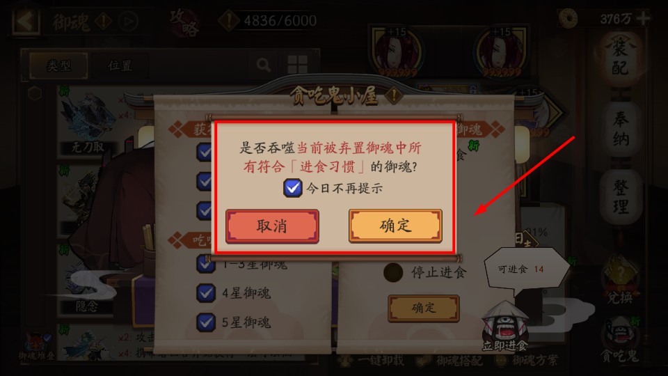 4、点击【立即进食】弹出确认框,勾选【今日不再提示】后选【确定】完成吞噬。