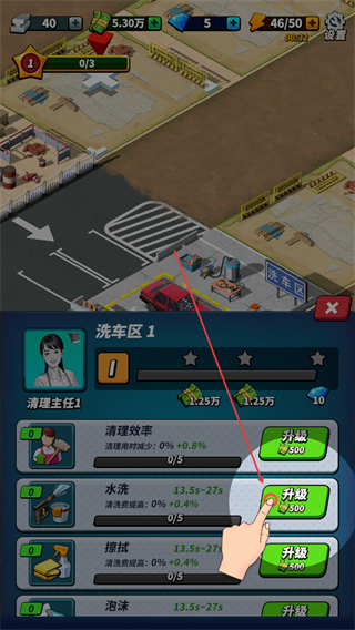 2、在洗车区界面,升级洗车模块如水流提升清理效率,处理车辆清洁任务。