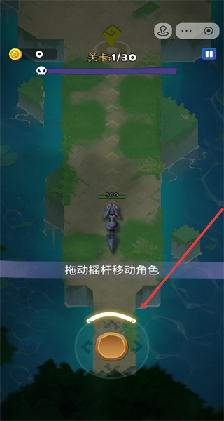 1、在关卡1界面,拖动底部摇杆移动角色,启动关卡,开始炮台闯关进程。