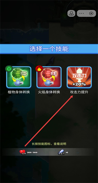 4、在技能选择界面,点击“攻击力提升”技能,增加炮台输出伤害,为后续关卡提升战斗效率。
