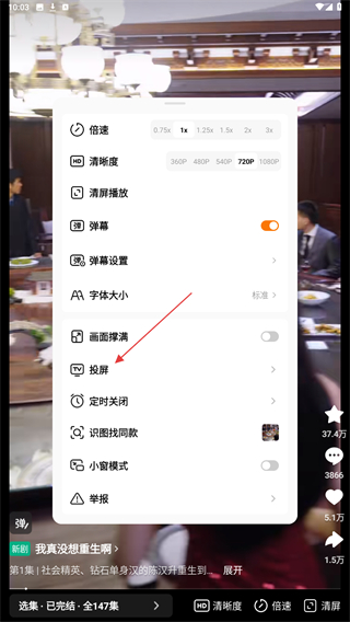 4、在弹出的菜单栏中,点击标有投屏的按钮即可。