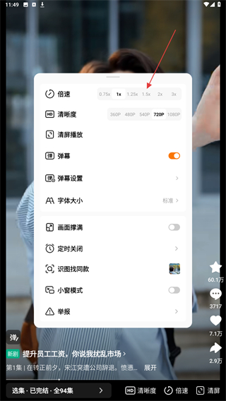 4、在播放页面弹出菜单栏时,点击要倍速的速度即可。